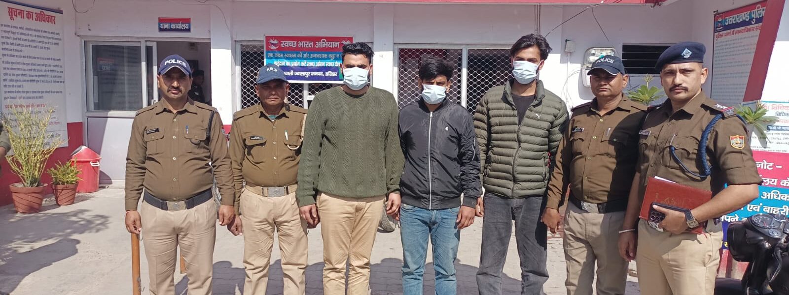 धोखाधड़ी के आरोपी को गिरफ्तार करने आयी यूपी पुलिस पर हमला करने वाले तीन आरोपियों को ज्वालापुर कोतवाली पुलिस ने गिरफ्तार कर लिया है। आरोपी के बेटे ने साथीयों के साथ दबंगई दिखाते हुए यूपी पुलिस के वाहन पर हमला कर दिया था। पुलिस ने आरोपियों के कब्जे से घटना में प्रयुक्त थार और स्कॉर्पियो भी बरामद की है। घटना में शामिल अन्य आरोपियों की तलाश की जा रही है। 3 फरवरी को मुजफ्फरनगर के थाना छपार के एसआई अनुराग सिंह टीम के साथ धोखाधड़ी के मामले में वांछित अभियुक्त संजय पुत्र राजपाल को ज्वालापुर से गिरफ्तार कर ले जा रहे थे। इसी दौरान भूमानंद अस्पताल के पास आरोपी के पुत्र ईशान्त ने अपने पिता को छुड़ाने की कोशिश में अपने साथियों के साथ मिलकर पुलिस के वाहन पर स्कॉर्पियो और थार गाड़ियों से टक्कर मारकर जानलेवा हमला कर दिया। घटना में पुलिस टीम घायल हो गयी और वाहन भी क्षतिग्रस्त हो गया। यूपी पुलिस पर हमले की सूचना पर मौके पर पहुंचे एसएसआई खेमेन्द्र गंगवार, एसआई रविंद्र जोशी, कांस्टेबल मनोज डोभाल, भागचंद व ताजवर चौहान ने तीन आरोपियों ईशान्त पुत्र संजय, शिवम मलिक पुत्र अनुज मलिक व अमन पुत्र गजेंन्द्र निवासी सुभाष नगर ज्वालापुर को गिरफ्तार कर लिया और घटना में प्रयुक्त वाहनों को कब्जे में ले लिया।
