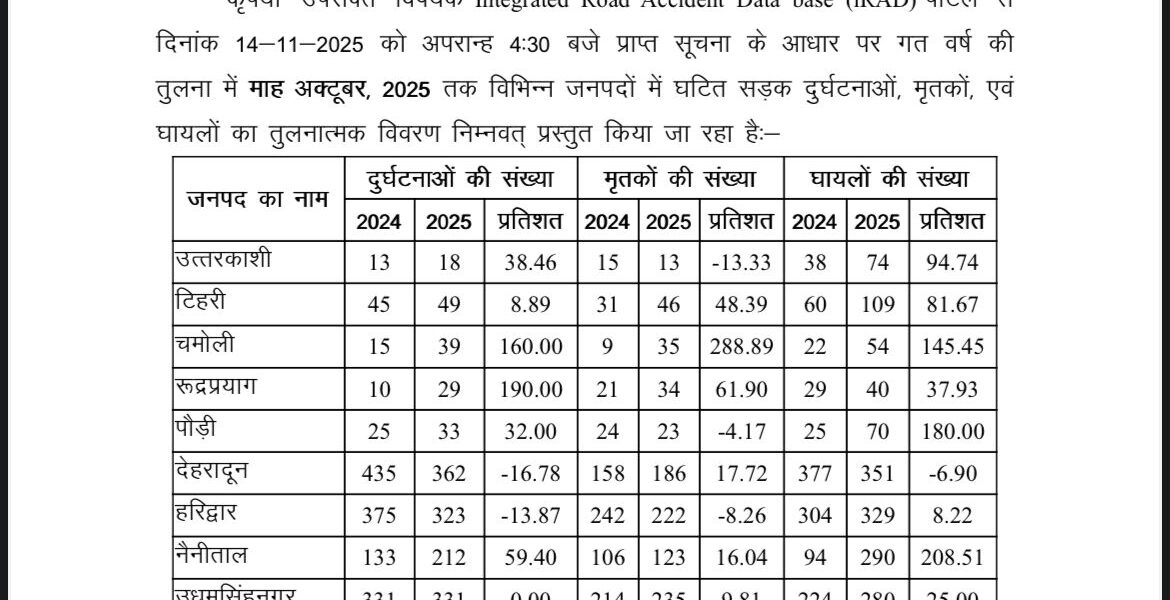 राज्य में सड़क दुर्घटनाओं से संबंधित हालिया आंकड़ों के विश्लेषण से यह स्पष्ट होता है कि हरिद्वार जनपद ने सड़क सुरक्षा के क्षेत्र में उल्लेखनीय सुधार दर्ज किया है। माह अक्टूबर, 2025 तक के आंकड़ों के अनुसार गत वर्ष की तुलना में हरिद्वार में सड़क दुर्घटनाओं की संख्या में लगभग 14 प्रतिशत की कमी दर्ज की गई है, जबकि दुर्घटनाओं में मृतकों की संख्या में भी उल्लेखनीय गिरावट देखने को मिली है।