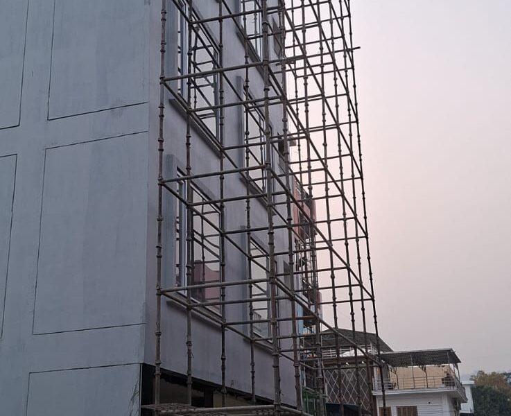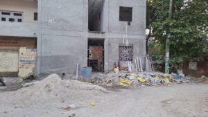 निर्माण की स्थि बिना सेटबैक (सड़क से दूरी, ओपन स्पेस, फायर सेफ्टी आदि) के पूरा हो चुका भव्य होटल भवन। यह आवासीय जोन में व्यावसायिक उपयोग के रूप में चल रहा है, जो हरिद्वार मास्टर प्लान और बिल्डिंग बायलॉज के स्पष्ट उल्लंघन है।